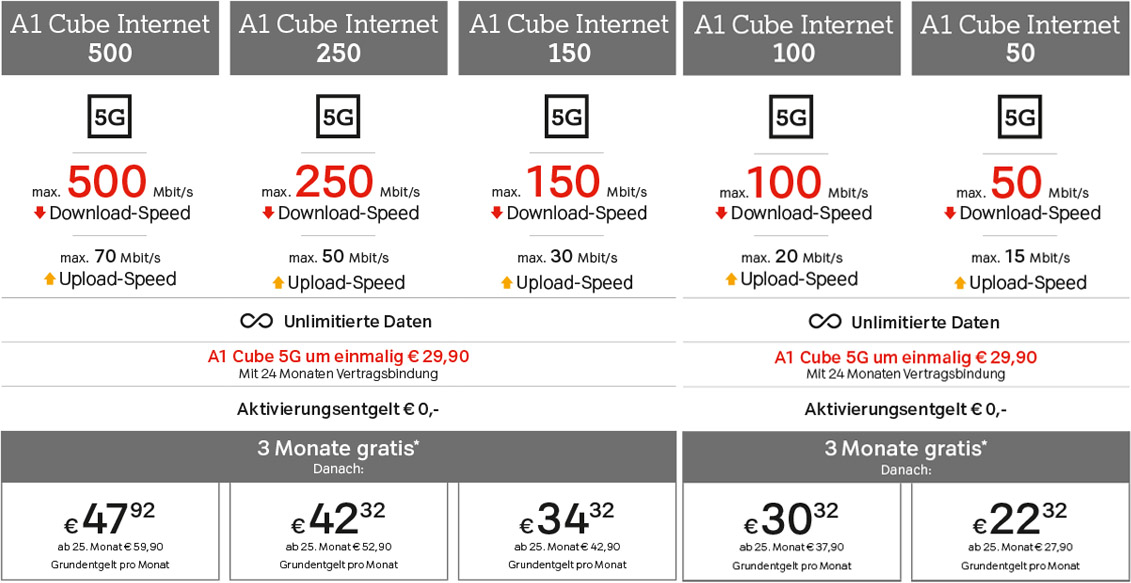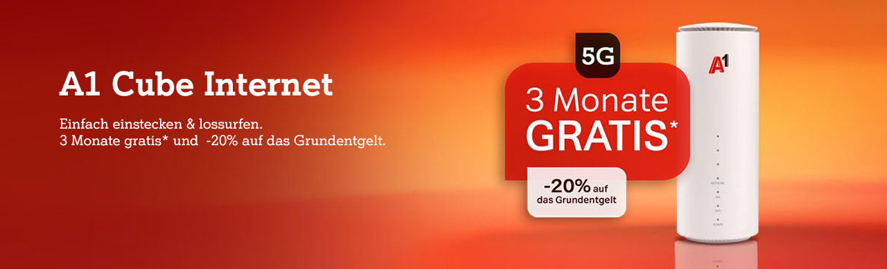 *Bindung 24 Monate. Reduziertes Grundentgelt für 24 Monate. Gerätepreis 5G Cube: einmalig €29,90. zB A1 Cube Internet 50 für 3 Monate um € 0, ab 4. Monat € 22,32, ab 25. Monat € 27,90. Nur gültig für Neukunden.